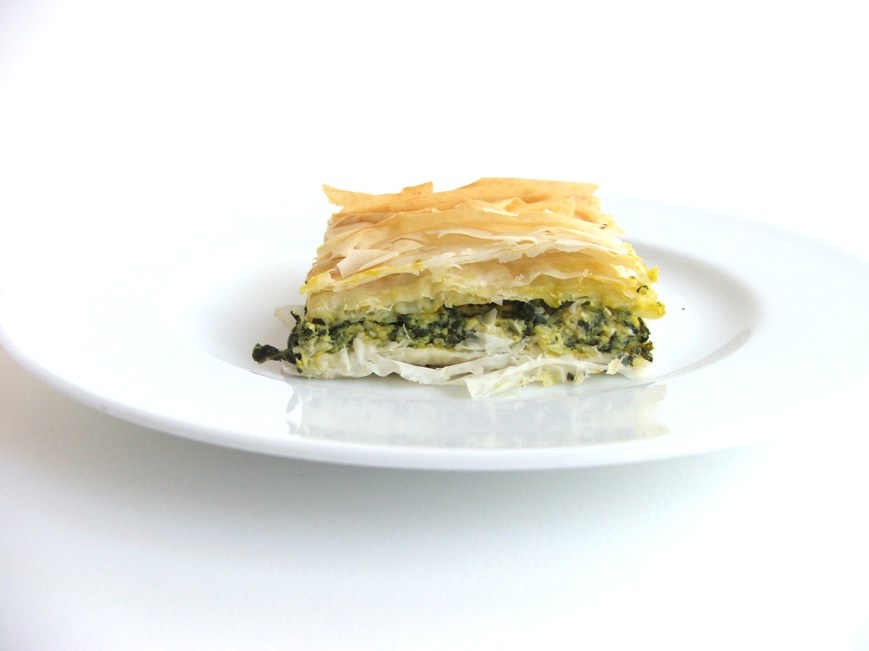 You may need to cut the phyllo sheets in half. If so, tightly wrap what’s left and put it back in the fridge. Working quickly, brush a little butter in the pan, lay down a sheet, lightly brush it with butter, lay down the next sheet, etc. until you have used 8 – 10 sheets or half your stack. Spread on the filling, then repeat with the rest of the phyllo sheets. If you have some butter left, spread more on the top sheet or two. Cut the spanakopita into pieces through the top layer of dough, then put in the oven and bake until the top is golden and the filling looks solid where you cut it, about 40 minutes. Let cool for a few minutes, cut through the bottom, and enjoy!