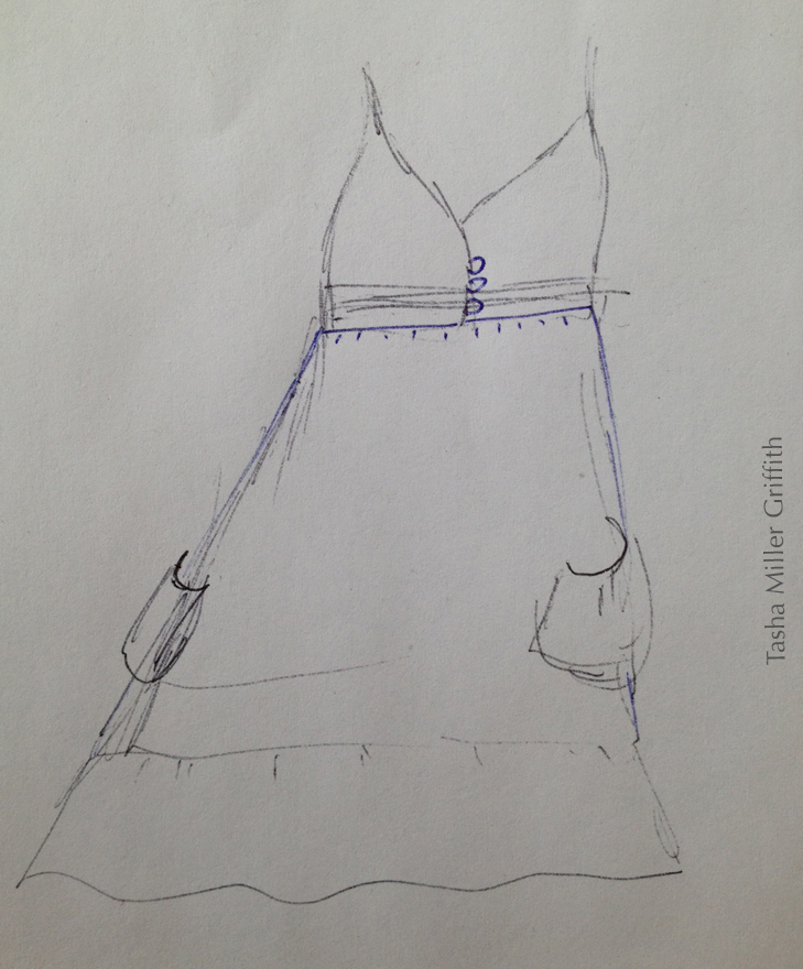 Here is my sketch of the finished sundress.  I haven’t decided whether to do the big patch pockets or not.