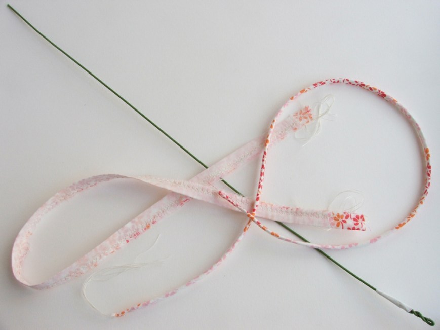 After stewing it around in my brain for a while, I remembered that I had some millinery wire left over from another project.  I twisted one end into a loop, tied the thread ends to it, and pulled it through – viola!  Then I tried it with beading wire, which is much thinner and more flexible, but also worked just fine.