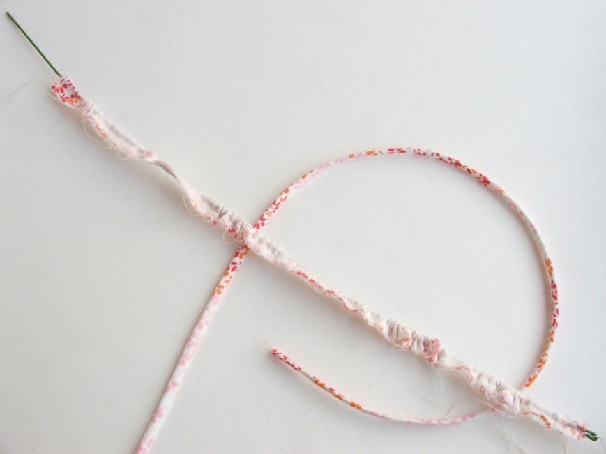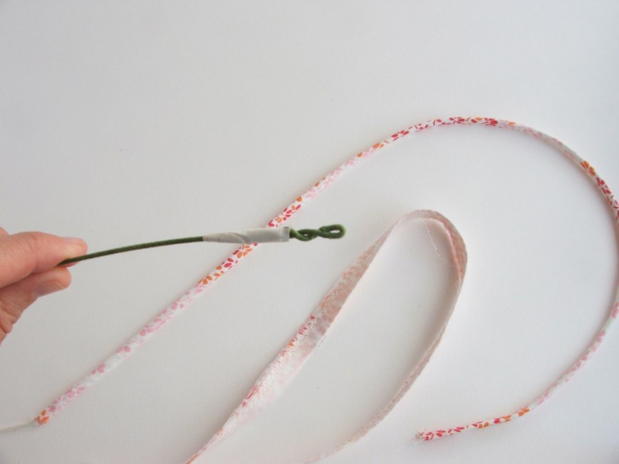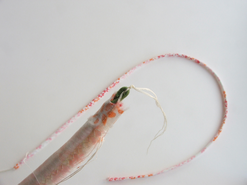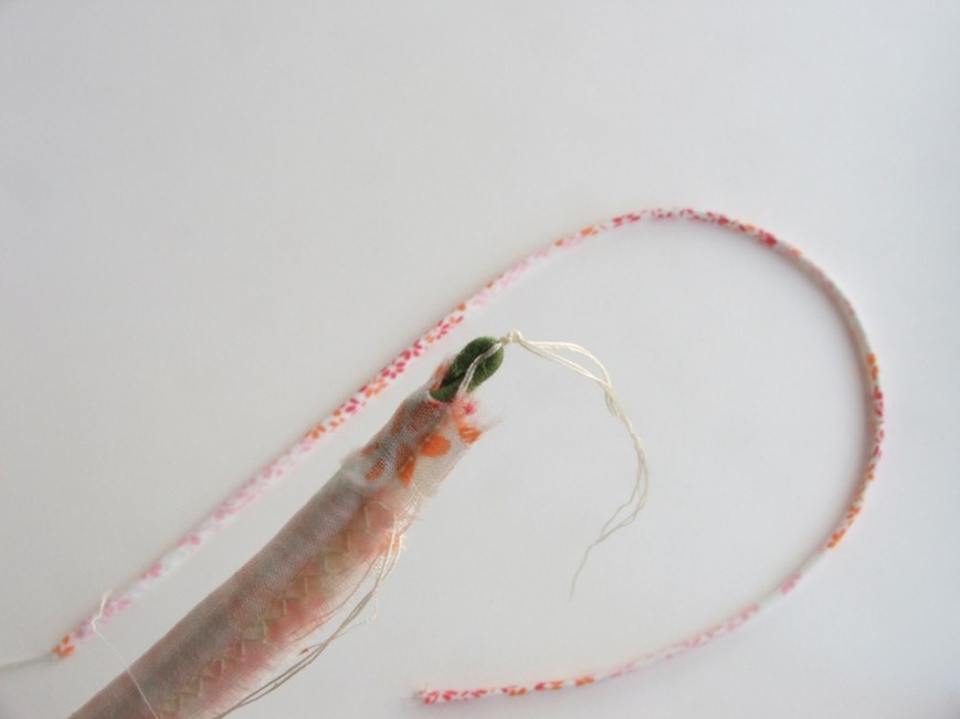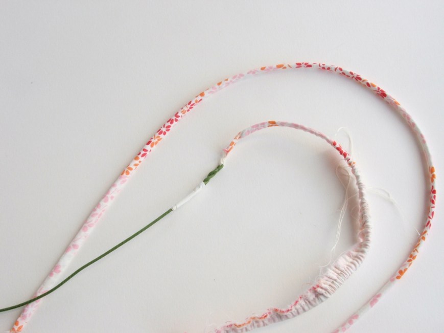 Pull the wire into the fabric tube, and the tube should start to turn inside itself.  Sometimes it’s a bit hard to get it started, you can try using your finger nails to pull the scrunched up fabric over the end.