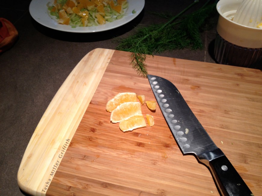 And a tip on chopping orange sections: I have been doing this a lot the past month or so, and my best method so far is to separate the sections first, then line up three or four and chop them into pieces. You’ll see most of the seeds and you can pull them out. I only pull the membranes off the sections if I need the dish to be really impressive for some reason.