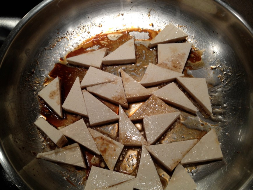 Pan-marinated tofu: this seems like a good time to include this technique, which I use pretty much every time I make tofu. Start with extra-firm tofu. Cut it into slices, rectangles, triangles, whatever you like. In a large skillet, heat a generous splash of peanut oil (sorry about the no-measuring for this part, I just don’t!) over medium heat. When it’s getting hot, add in a splash of soy sauce, a splash of rice vinegar or lime juice, and a small spoon of brown sugar. Stir around until the sugar dissolves, then add the tofu. Stir the tofu around, then shake the pan occasionally while the liquid evaporates. Keeping the heat on med-low, and stirring when you first put the tofu in will help keep it from sticking to the pan. Once the liquid is gone, a nice caramelized crust will form on the tofu – yummy! I haven’t found a better way than to flip each piece over once the bottom is brown and crispy. If there are patches of sauce left, steer the flipped pieces onto those. You can also add a little more of the marinating ingredients if necessary. When both sides have a lovely golden crust, you’re done! Flip the tofu out onto a plate to cool. I did this one day as an experiment, and I have done it every time since, when I make tofu for Pad Thai, curry, etc. Side story: once I was hanging out with my brother while he was grilling brats. He said it’s the juice dripping down from the meat and being shot back up by the fire that makes it taste good. Sometimes I think of this technique as giving the tofu some tasty juice of its own. Ok, back to the noodle salad.