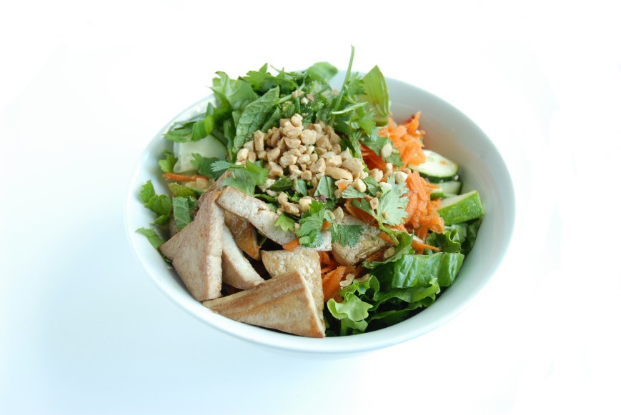 Assembly: put the bean spouts and cooled noodles in the bottom of a bowl. A wide shallow bowl would be ideal, since the sauce tends to sink to the bottom (otherwise, stir it up). Top with veggies, herbs, tofu and peanuts, and pour sauce over the whole thing. Enjoy!