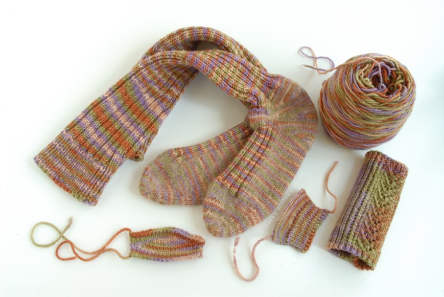 One of the things my knitting students have a lot of questions about is gauge, so I thought it would be a good topic for a post. I am helped out on the visuals here by my aunt Kathy, who gave me a lot of this yarn (thanks Kathy!). A LOT – I made all this stuff, gave 2 skeins to my friend Becca, and still have the ball you see left. It’s been interesting for me, since I would normally not make several things from the exact same yarn.