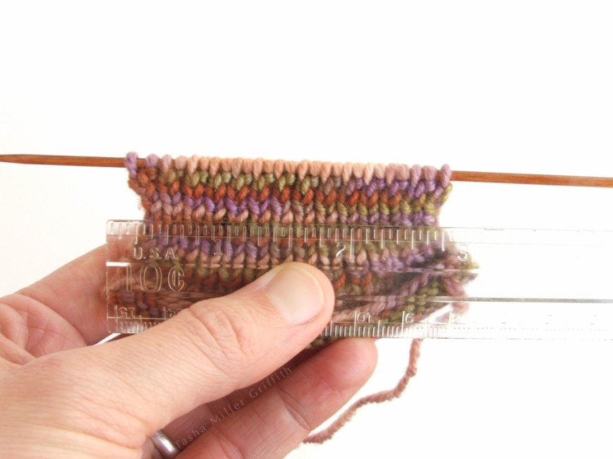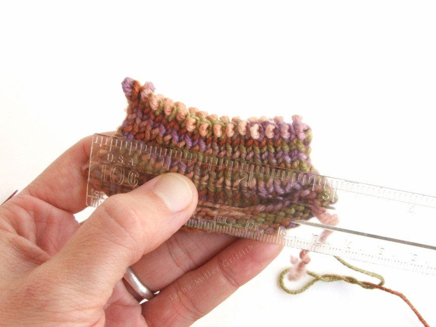 Each “V” or tiny mountain is one stitch. Line your ruler up with the starting line between two stitches. Count the stitches (it helps to have a spare needle or something else smaller than your finger to count with). If you count over more stitches you’ll get a more accurate measurement, especially if you have halves or quarter stitches in each inch, so count over 2″ or 4″ or however many you can in your sample, and then divide to get your number of stitches per inch. When measuring, take your sample off the needles, or slide it onto the center cable if you are using a circular needle, or bind it off if you want to keep it. You can see here how the needle is holding the stitches apart, taking the sample off changes the measurement by 1/2 stitch per inch!