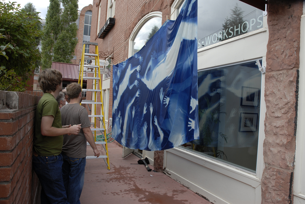 Some of you may be wondering what I have been up to lately, besides cooking and (occasionally) posting about it here.  Well, in part – this!  Bryan has a solo show on at the Flagstaff Photography Center for the next month, and for part of it he had this crazy brilliant idea to make a huge public participation project.  On silk, panels 12′ by 6′.  Which would hang on curved wooden supports (making that part was his responsibility).  The idea is that you walk through it, not just look at it, and the fabric touches you and moves with the wind, thus making a different, more interactive experience of what a photograph can be.