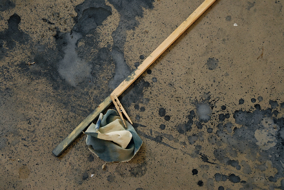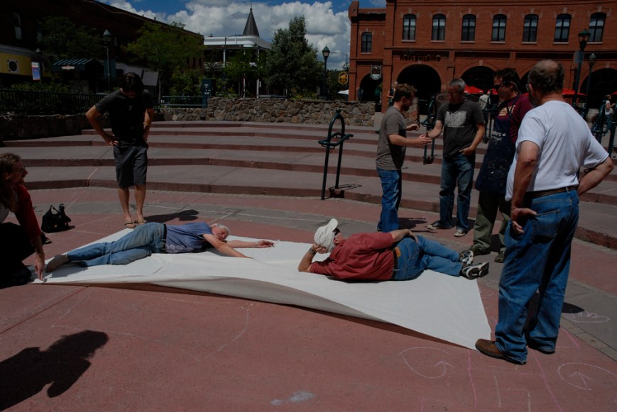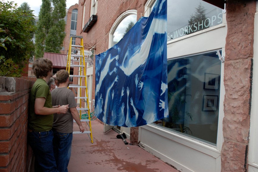 On the morning of the exposure, we set up (mostly) clean trash cans to hold water for rinsing, a hose, the muslin sheet so everyone could practice where to put their hands and bodies, and a hugely tall clothesline to hold the finished pieces while they dried.  Thankfully, a bunch of our friends and members of the photo community showed up and agreed to lie still in the sun for 15 minutes while they and the silk sheets took in enough light to make a photo.  And thankfully the monsoon clouds held off just long enough to get it done (it rained later)!  Bryan repositioned people partway through to get a lighter blue in some places.