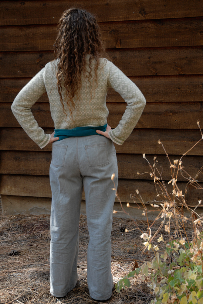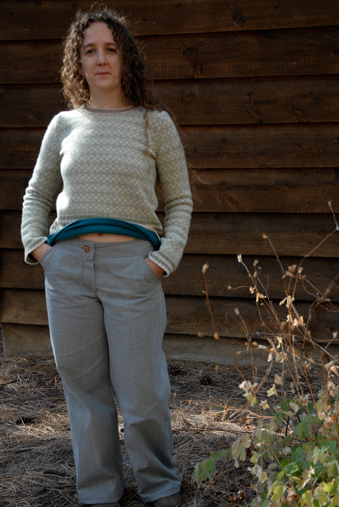 I also haven’t had a huge amount of luck making my own pants, until now that is! I’ve definitely made pants, lots of trial ones and some real ones, but there are just so many variables that sometimes it’s been hard to tell exactly what to change for my next pair. This pair, however, is really close, and I learned a lot along the way, mostly thanks to my internet friends. I just feel so self-sufficient wearing these pants, it’s fantastic! On their very first day I wore them to hang a show of Bryan’s work at a restaurant here, climbing up and down ladders and carrying things around. Then the next day I wore them with a nicer sweater and looked totally presentable (ok, after wiping off some grime from the day before . . . )