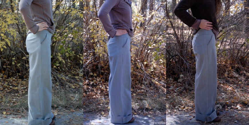 The third thing I learned was that there’s great info about fitting pants on the web! Even though I scoured every single mention I could find in Threads magazine, again, the most useful stuff I found was on other blogs. Thanks especially to Tasia’s post of fitting resources (her pattern would be a good place to start on pants if you’re pear shaped like me), where I linked to Sunni’s enormously helpful trouser sew-along (my pants looked remarkably like hers in the back picture here).