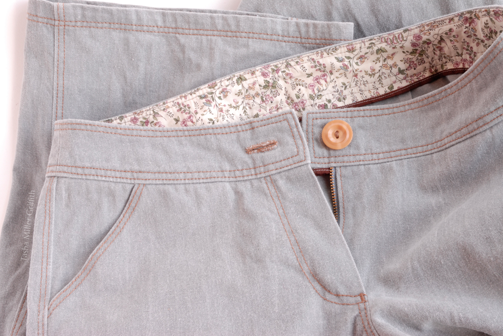 Just a couple of construction notes: I used a rayon ribbon to bind the bottom of the waistband, which I quite like, although next time I’ll try to get it closer to the bottom waistband seam so that it doesn’t flip up. I debated whether this was too much top stitching, but on the pants when worn it doesn’t stand out much at all. This is my third try at a vintage button, the first two did not survive a trip through the washer, by which I learned that if a button looks crumbly, it probably is, and if it snaps in half like a fortune cookie in your fingers, well, it wasn’t going to stand up to much.