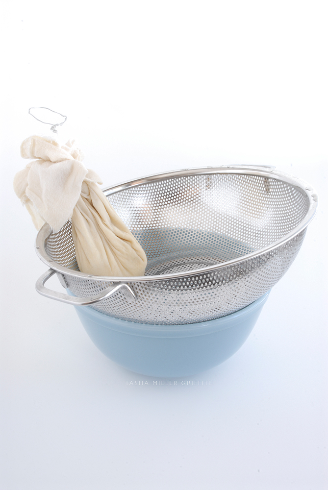 That’s about it! Leave your cheese to drain for an hour or more, depending on how firm you like it to be. If I’m making paneer I want it to be sliceable, so I’ll leave it longer than for soft goat cheese. You can always open the cheesecloth and check to see if it has reached the consistency you want. If you’d like it to be firmer, just tie it back up and leave it to drain a little longer. You can also press the cheese after draining, between two plates with something heavy on top, and leave it in the fridge like that for a few more hours to make it even firmer. So like I said, lots of options.