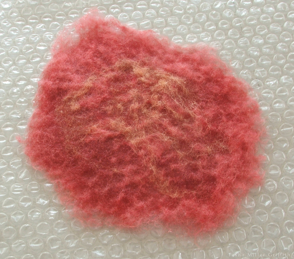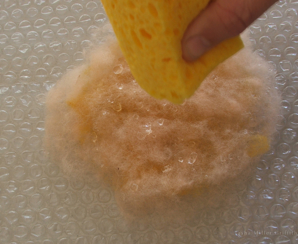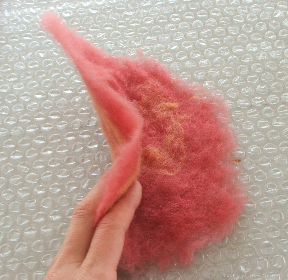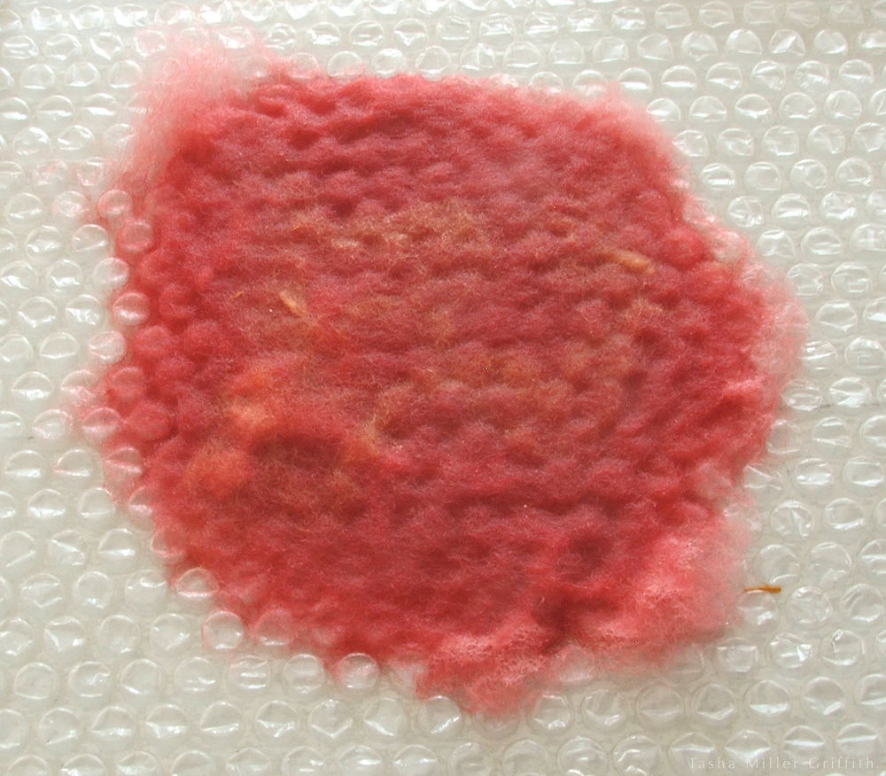 Agitation. Arguably this is the last step, but there are a few stages to it. At first, you’ll need to rub the felt very gently. You want the fibers to cling together, which they won’t do if they’re being shifted all over the place. For wet felting small pieces like this, I like to use two layers of bubble wrap (the ordinary, small-bubble kind), one underneath the fiber and one on top. The bubble helps spread and soften the motions of your hands. Think about getting the bubbles to massage the wool, not about moving your hands on the bubble.