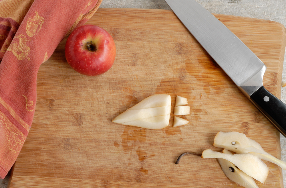 In the pear crisp recipe, I mentioned that I love it when pears are ripe enough to cut the core out in one smooth stroke.  This is what I mean, this one barely is ripe enough, you can feel where to slide the knife along the edge of the hard core, from the top to the bottom.
