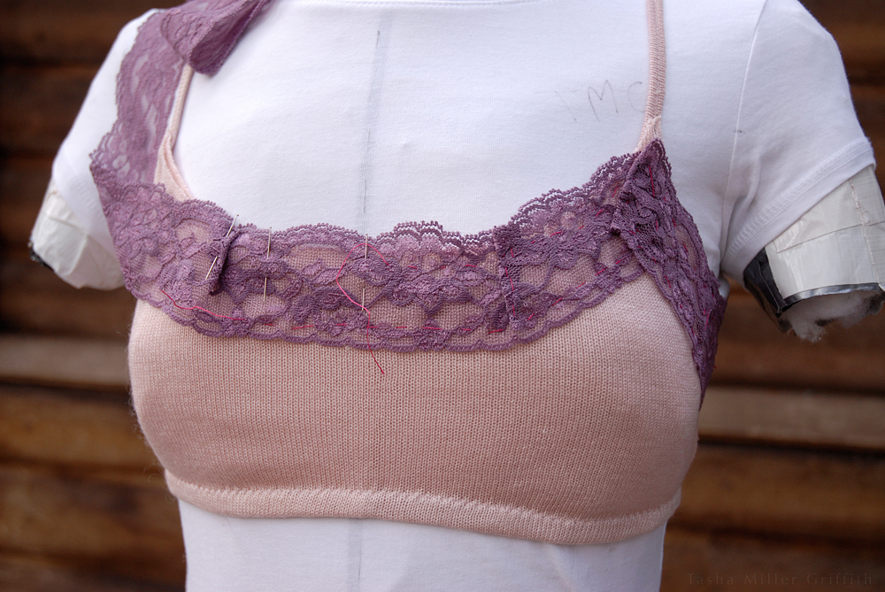 Some good places to use basting are: when you want things to align exactly (like matching stripes), when there are a lot of shifty layers (like the collar seam), or any other time when you want to make sure some part of your project will stay in place while you sew it.  For the soft bra below, I knew there was no way the lace would stay in the folds I wanted against the fabric if it was held only by pins.  Plus, basting allowed me to put everything together on my dress form, seeing exactly how the lace would work on a body, and then take the whole thing off the form and sew it.