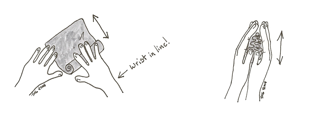 When I’m felting knitting by hand, or fulling a felt piece like the one illustrated in Part 1, I have a bowl of water about as hot as my hands can stand. I dip the piece into the water, squeeze some of the water out, and rub it. Two effective motions are rolling, and scrunching the felt between your two hands. You can also scrub it around on the bubble wrap, or even throw it against a hard surface to get the shrinking going. Whatever you try, remember to keep your hands in alignment with your arms and wrists in good alignment.