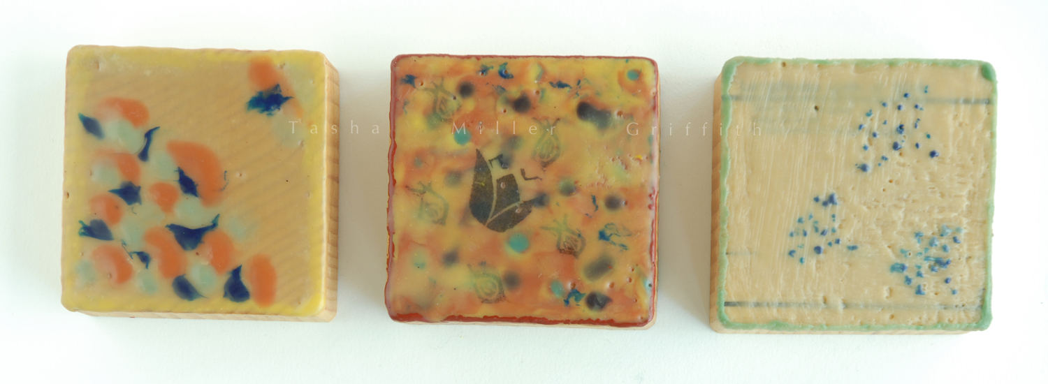 This year thanks to the generous donation of time and effort by a friend of my aunt’s, we got to try encaustic, an ancient technique of painting with wax that I have admired in the work of some of our art show friends for some time.  I was so excited to try it out, and impressed by how everyone jumped in and made art.  Really, playing with warm wax is pretty irresistible.