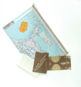 Really, why didn’t I think of this ages ago?  But actually, my lovely aunt Barbara introduced me to this idea at our craft retreat, which she in turn got from one of her teachers.  I have made a few handmade cards, and looked for envelopes to fit them, but it never occurred to me to just make one!  And, you can use all kind of cool recycled paper.  The kind that is too pretty/interesting to just put in the bin.  I going to use this map and guide from The Art Institute of Chicago, mostly because it has the word “varoom!” on it in big letters.
