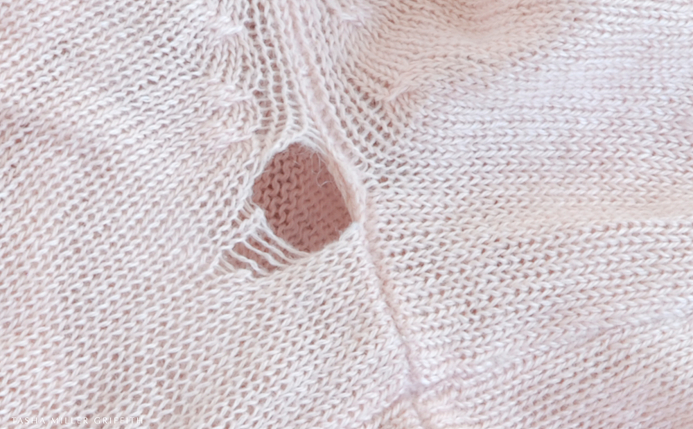 Guts: Picked up stitches around the neck/placket, and where the sleeve joins the body. “Seams” closed with mattress stitch between the two stitch patterns vertically in the body, and horizontally near the bottom of the sleeves.