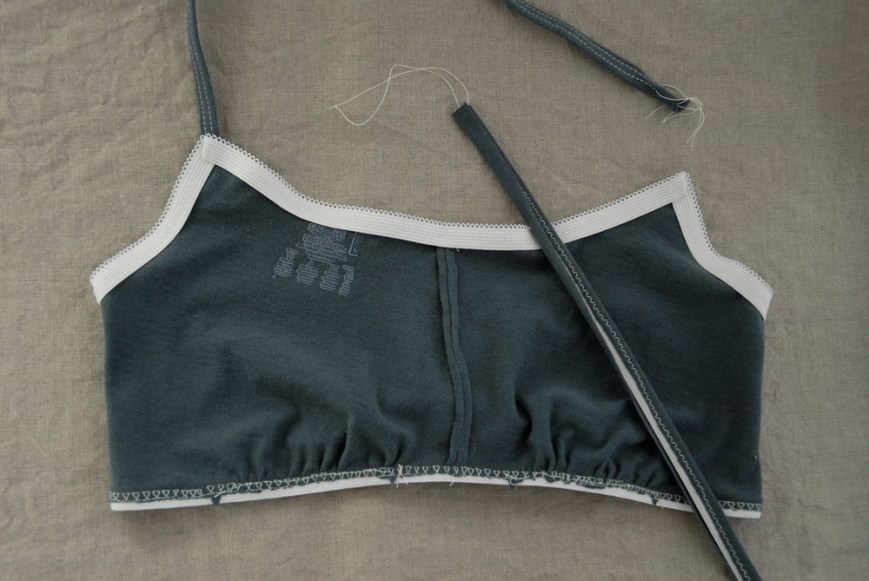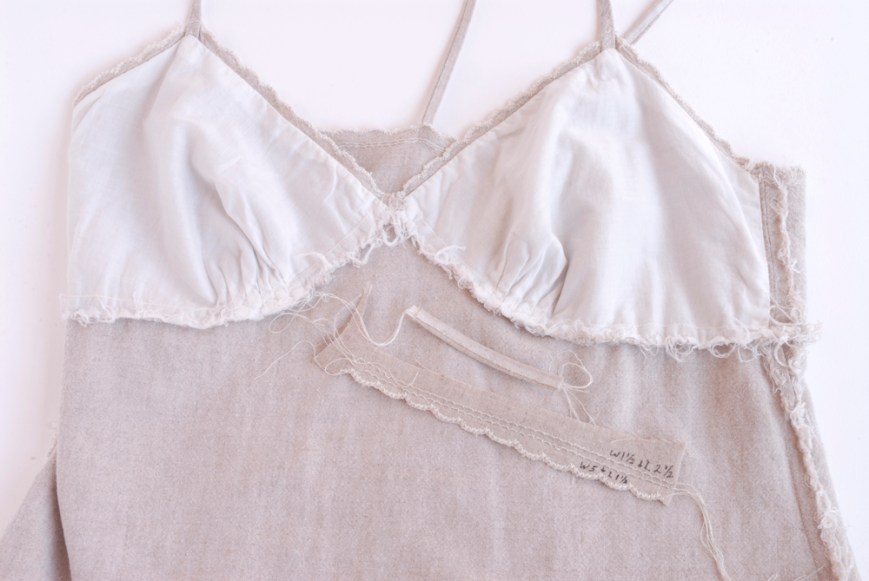 This was an old silk cami with a shelf bra inside, made from a thrifted top. As you can see, it had a lot of wear and had already been patched once. But there was still enough sound fabric between the body and the shelf to reconstruct a different cami (below). It’s certainly arguable that this was too much work, too much hand stitching, for a garment which realistically is made from worn fabric and has a limited life expectancy. And yet, it gave me a lot of freedom to experiment, and a functional garment …